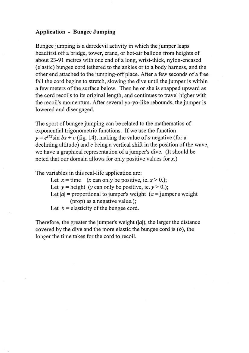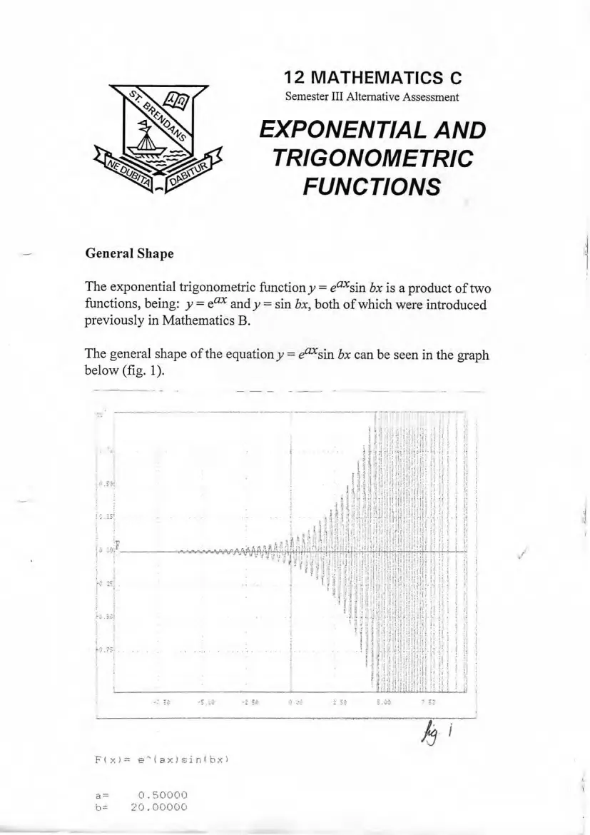 Your task is to investigate the exponential trigonometric function. In your investigation you will need to explain the general shape of the function and how variations to the different features of the function will alter the graph of the function. Give two real life examples of the function and explain how the various aspects of each example can be identified in the function.