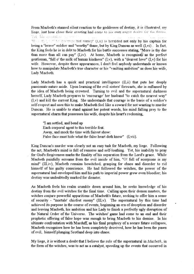 Investigate the influence of the supernatural on the course of events in the play Macbeth and report on them to King James I.